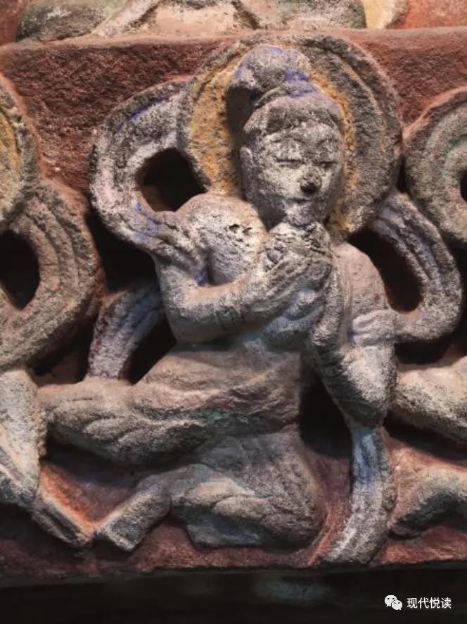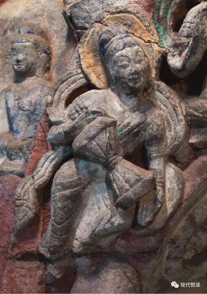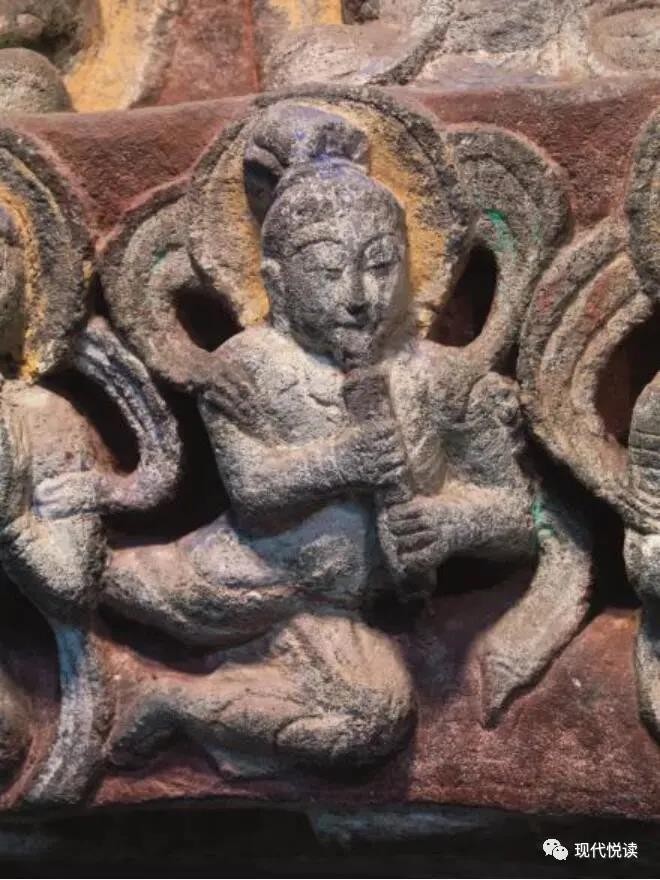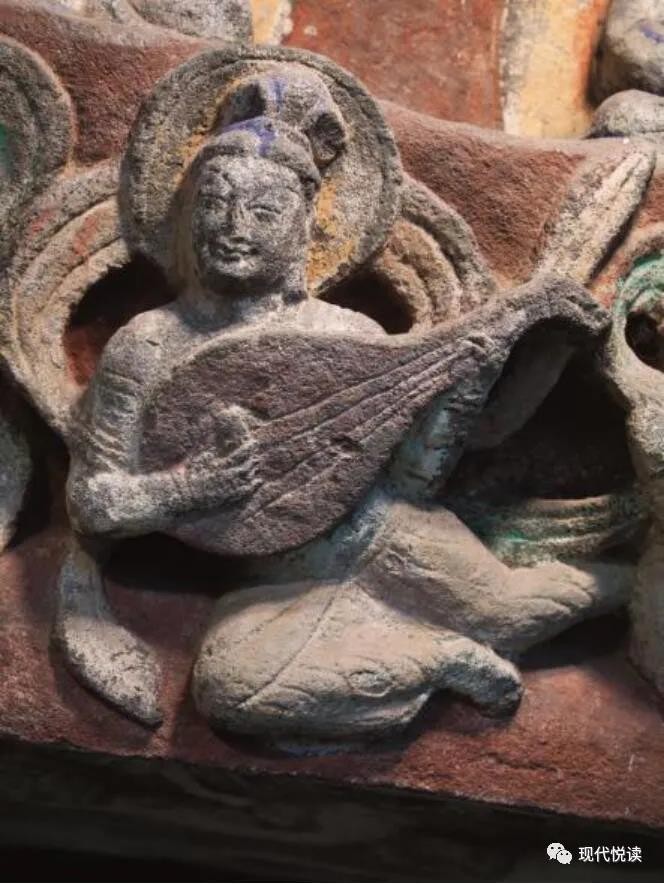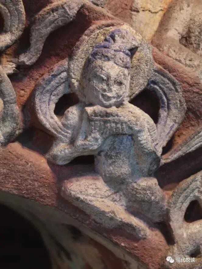 位于洞窟门楣下缘的10身伎乐天,姿态优雅自然、动作和谐飘逸,手持多种乐器。从上至下依次为腰鼓、齐鼓、五弦、法螺、筚篥、琵琶、义觜笛、腰鼓、排箫、鼓,是研究中国古代音乐史的珍贵资料。
