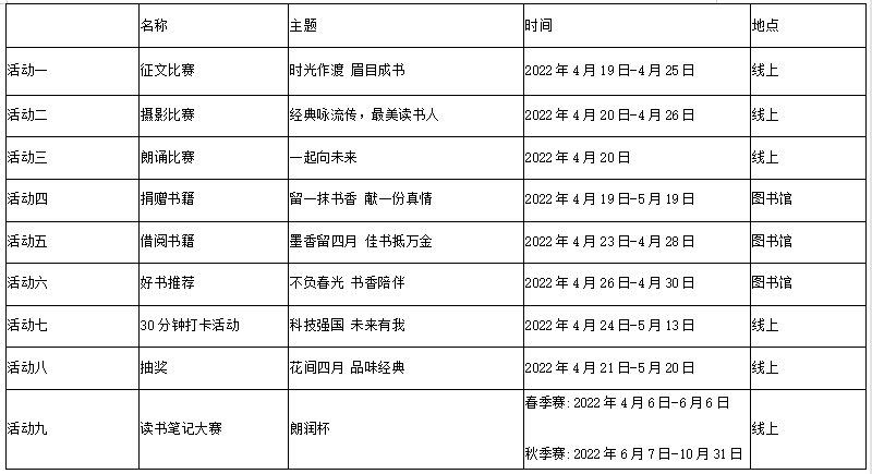 “一起向未来”主题朗诵比赛等待大家一展风采;捐赠一本书籍,献上一份真情;借书有奖活动,邀请大家前往图书馆借书,广泛阅读;推荐自己阅读过的一本好书,与人共享书中世界。