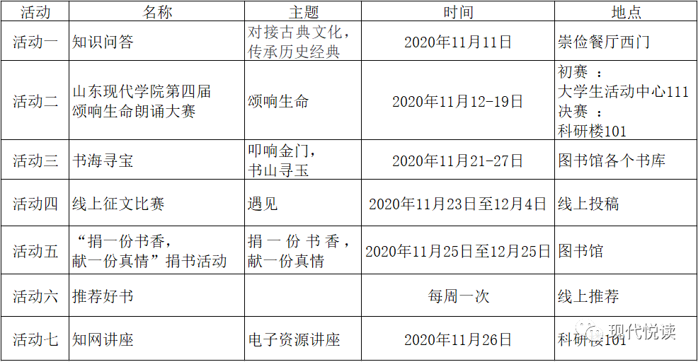 山东现代学院2020年“书香现代”读书文化节活动正式开始啦!以下精彩活动等你来参加!