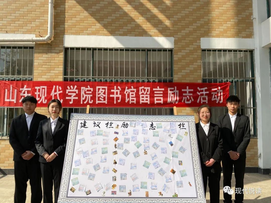 2021年4月14日,由山东现代学院图书馆联合共青团山东现代委员会举办,学生社团管理部读者承办的励志墙活动于山东现代学院图书馆举行,本次活动旨在激励现代学子为自己树立目标,听取现代师生的建议,推动现代学院图书馆的建设。