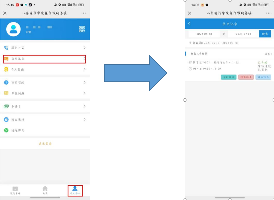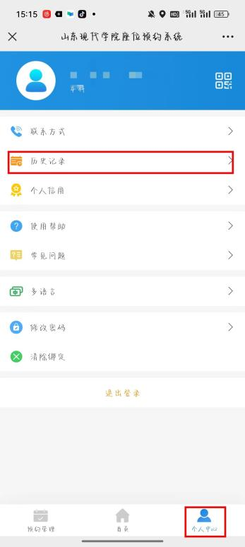 方法二:点击座位预约系统下方的个人中心➡历史记录➡提前结束或暂时离开。