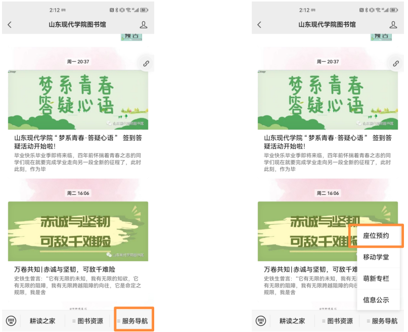 2.点击右下角“服务导航”后点击“座位预约”(因部分座位未配置到位,建议现场查看座位号预约)