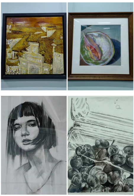 教学成果作品形式多样,书法、素描、油画、创意手工制品、石头画、剪纸、泥塑等,每个作品都栩栩如生,惟妙惟肖。
