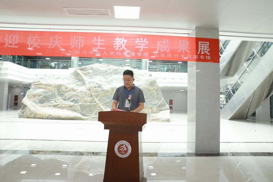 人文与管理学院院长李鹰教授介绍了本次展览的筹办情况,人文与管理学院学管就业副院长张靖麟、教师代表王冲、学生代表曹俞俞分别发表了热情洋溢的讲话,随后,徐兴余馆长宣布“迎校庆师生教学成果展”正式开始。