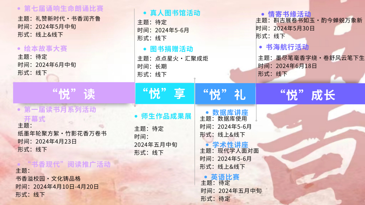 本届读书月系列活动设置了“悦”读、“悦”享、“悦”礼、“悦”成长四个板块,希望通过开展朗诵比赛、师生作品成果展、绘本故事大赛、学术讲座等阅读推广活动,进一步营造书香育人文化氛围,提升校园文化内涵,打造“书香现代”品牌。