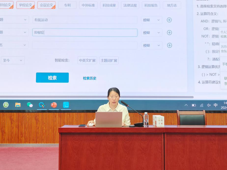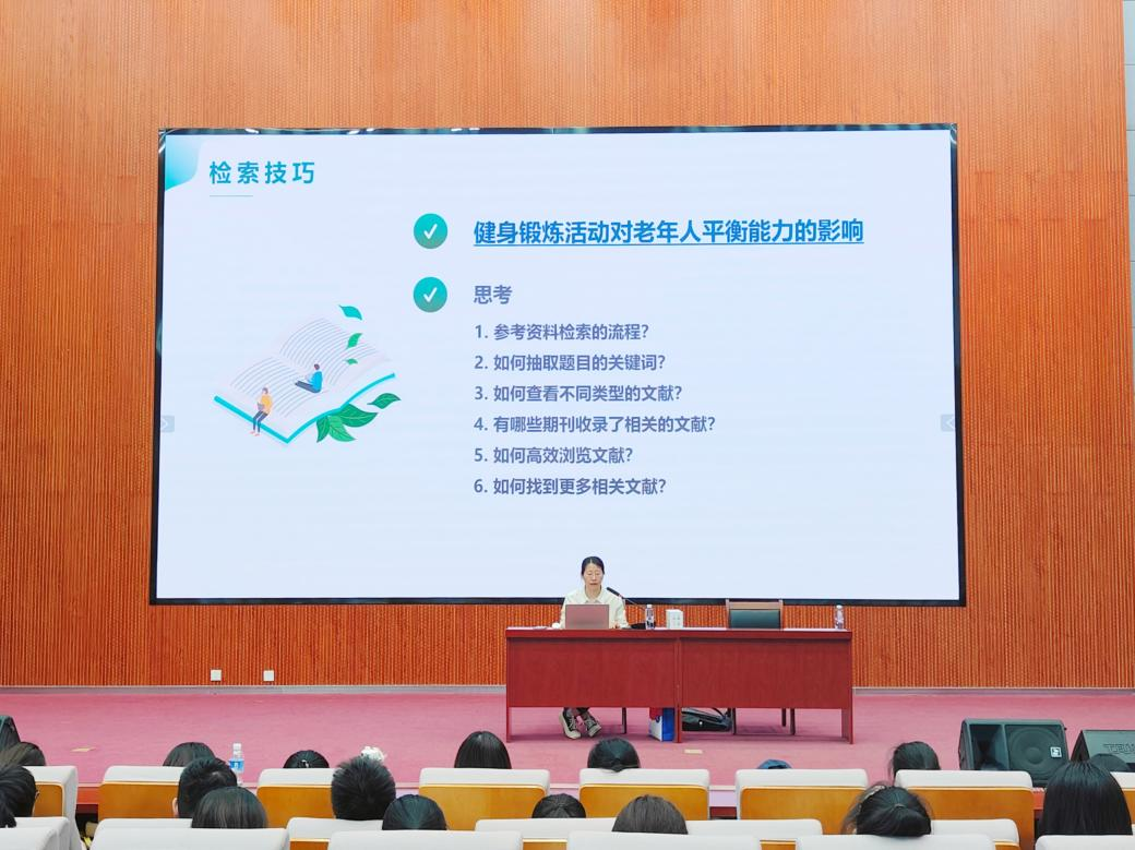 在万方智搜功能方面,郭老师主要简述了五个属性:智能检索、多维揭示、保障获取、个性化服务。接着根据资源导航、资源检索两个功能,详细地讲述了如何进行导航与检索。以“健身锻炼活动对老年人平衡能力的影响”为例,教授在场学子如何正确使用万方智搜。