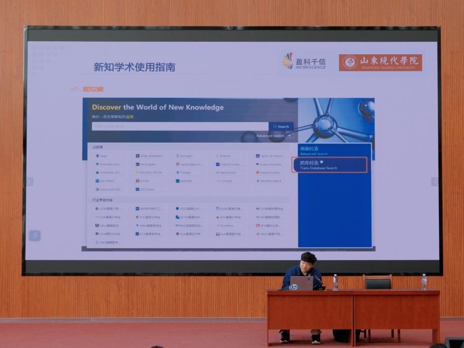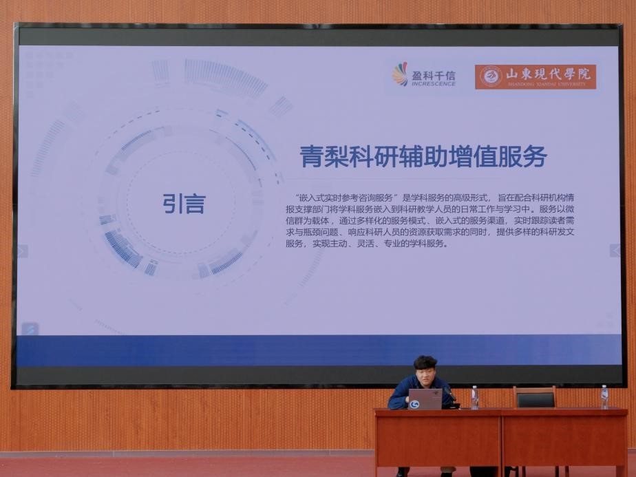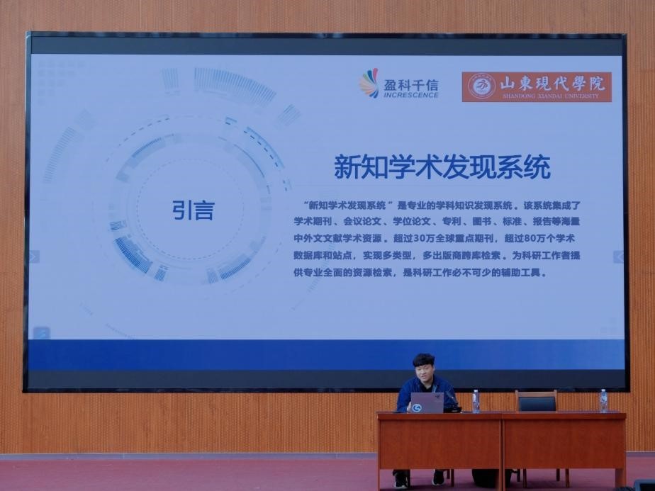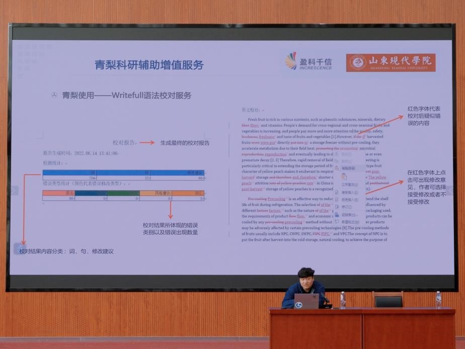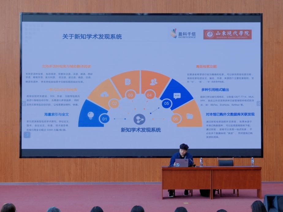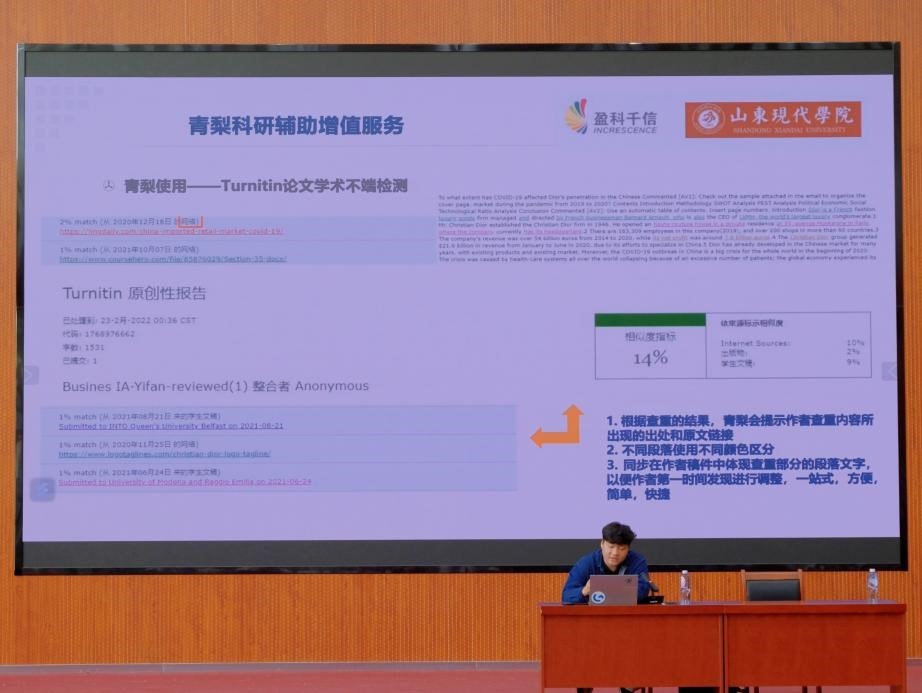 本场讲座,苏经理为学生们介绍了新知学术发现系统和青梨科研辅助增值服务。