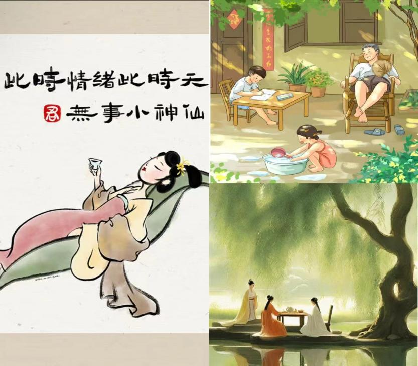 “帘外雨潺潺,小暑送炎,空调电扇也出汗。躲进深山常游泳,一晌贪欢。静气心清闲,美茶凉甜,吹尽清风自觉寒。任它小暑多闷热,舒心人间。”