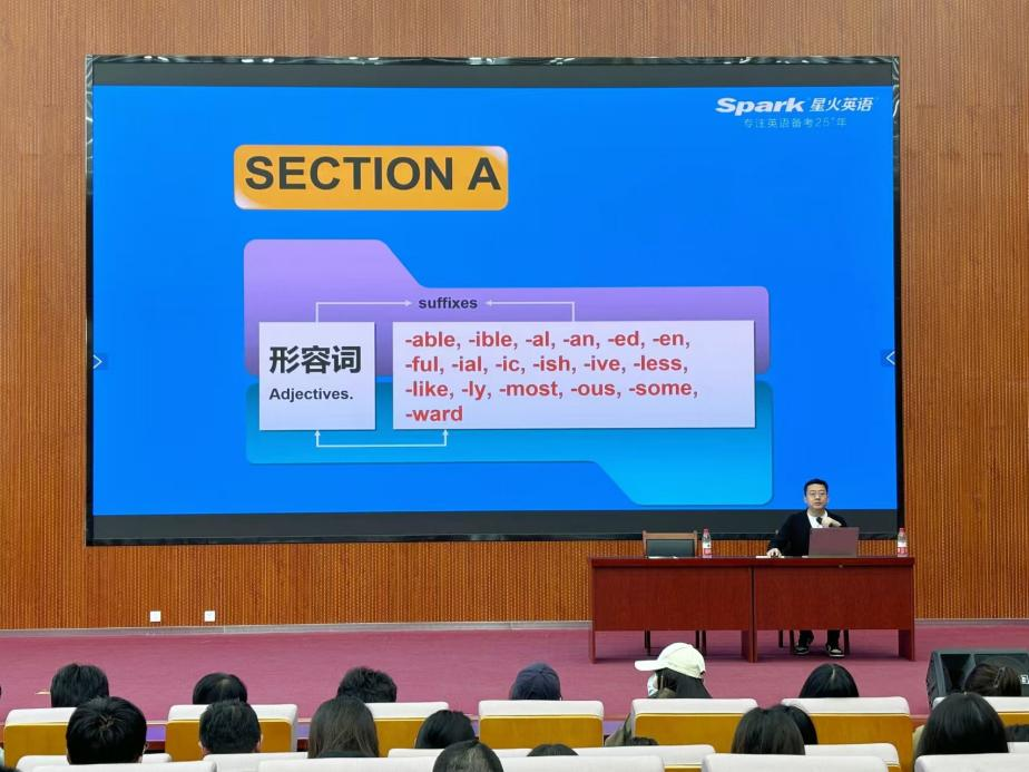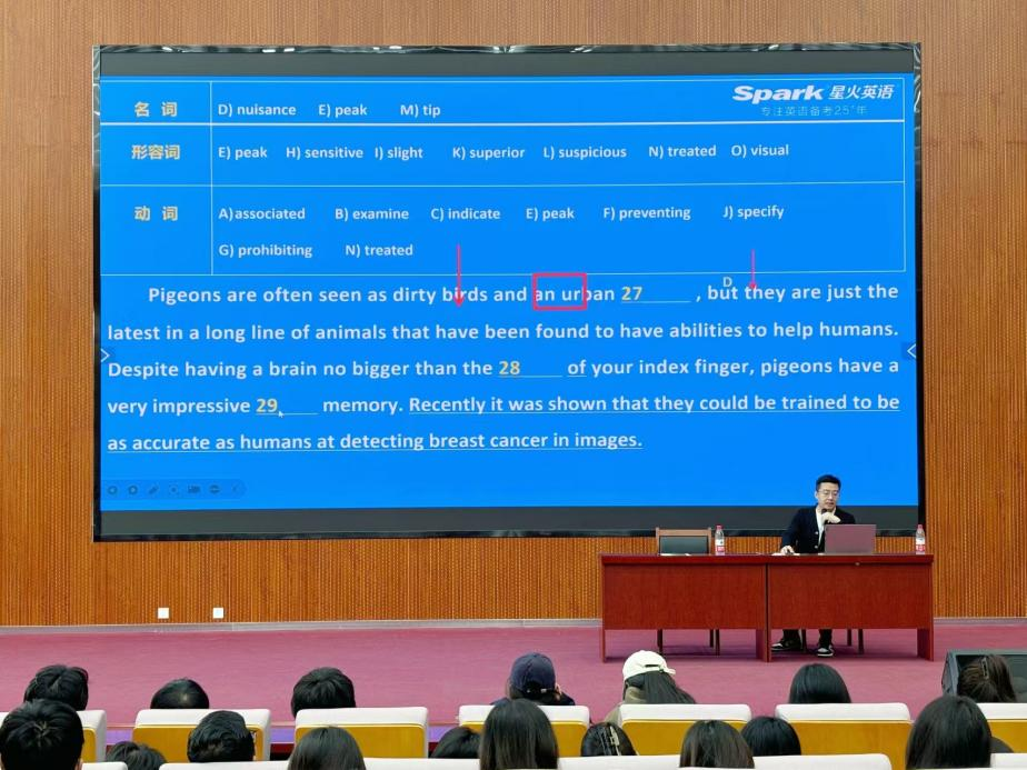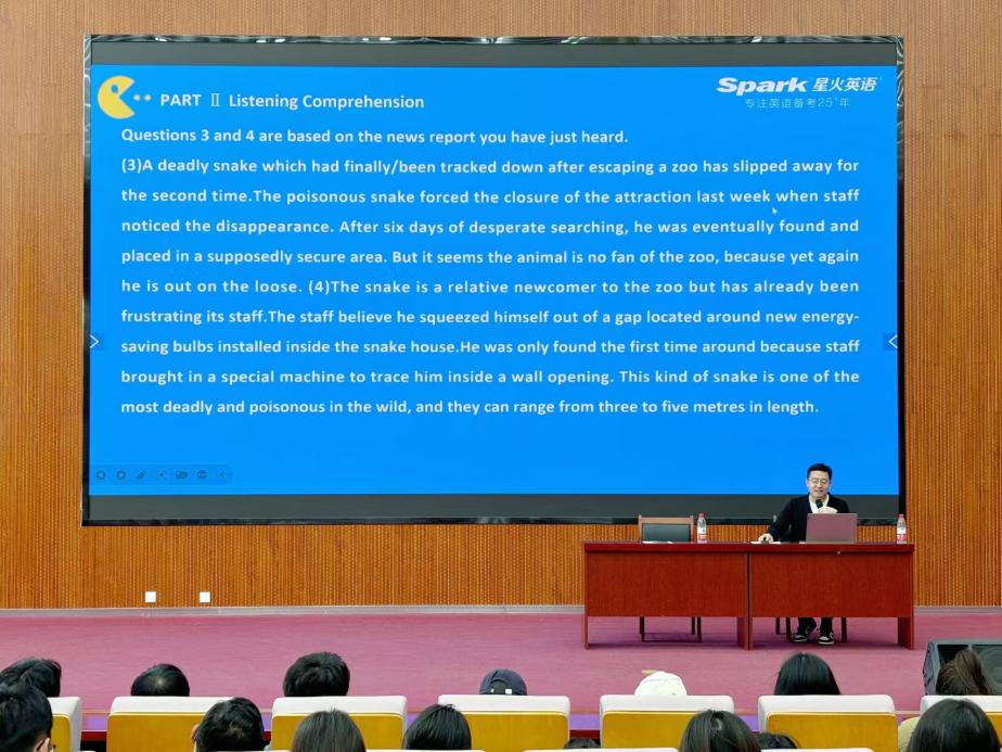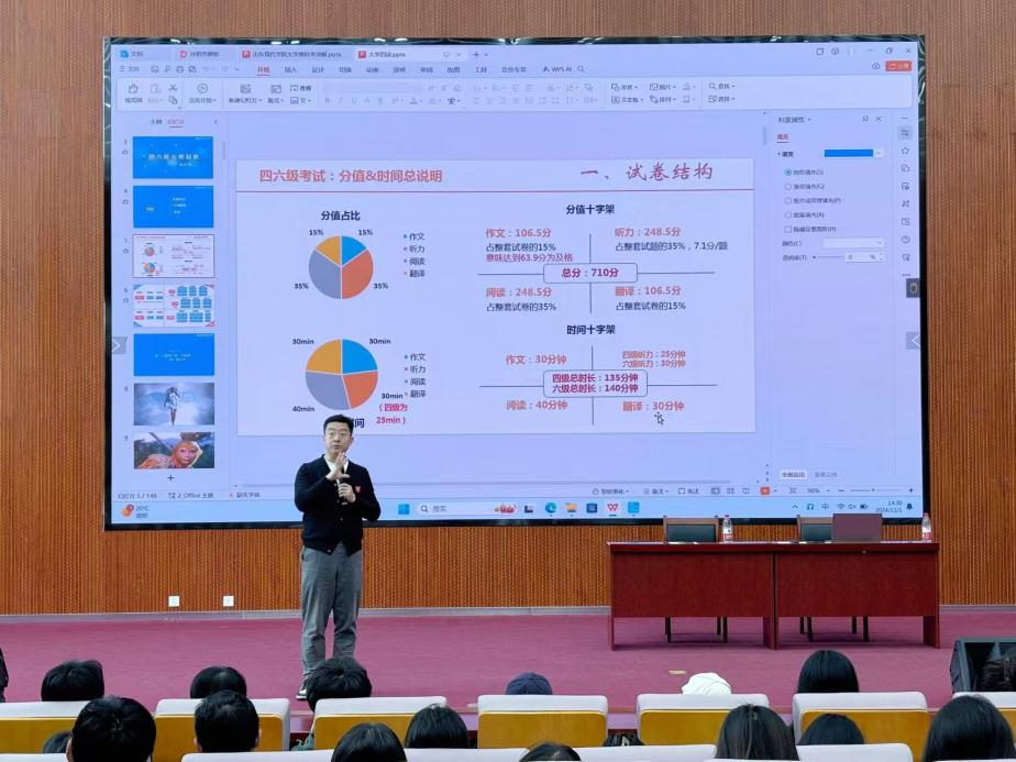 随后,他以其风趣幽默的教学方式将四六级考试的考题、分值、流程逐个解析,帮助各位现代学子缓解四六级考试压力。
