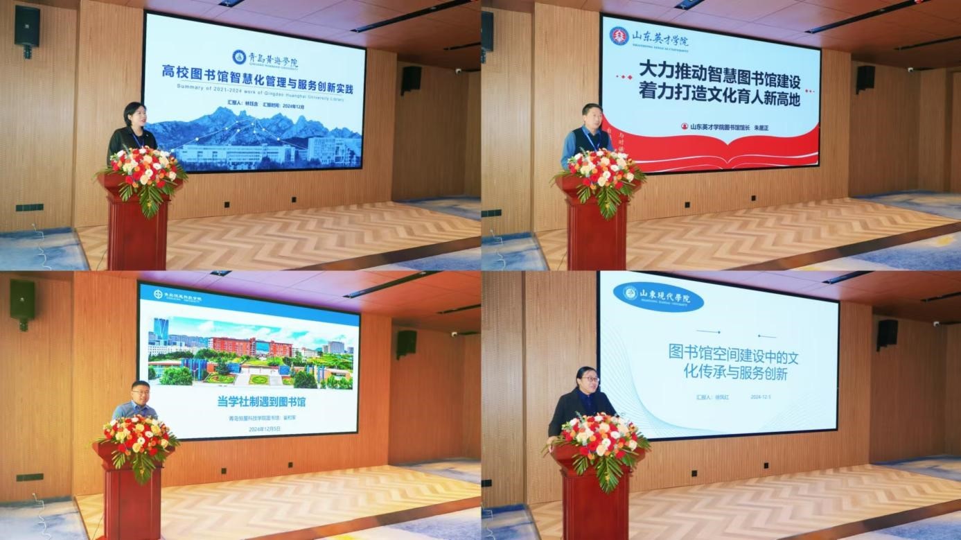 在图书馆论坛主题报告阶段,青岛黄海学院图书馆、山东英才学院、青岛恒星科技学院、山东现代学院等四所高校图书馆负责同志分别围绕“智慧化建设”、“文化育人”、“学社制融合”以及“空间建设中的文化传承与服务创新”等主题展开了深入而富有启发性的研讨,展示了各自在图书馆建设与服务方面的成果与亮点。