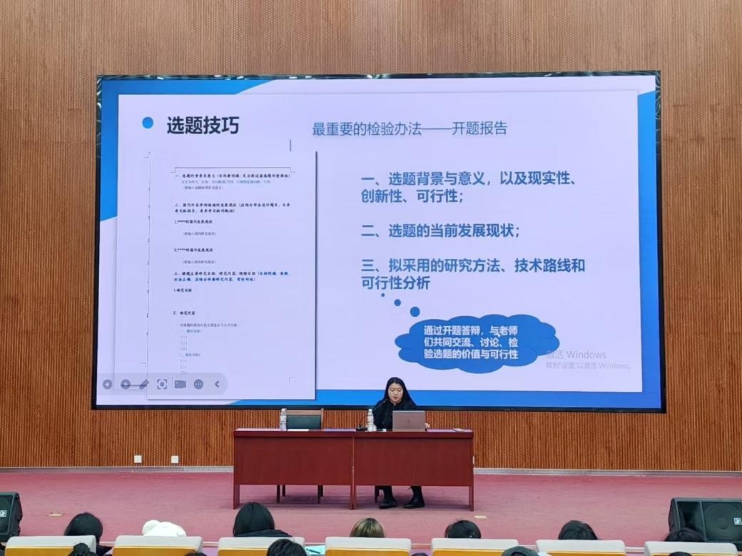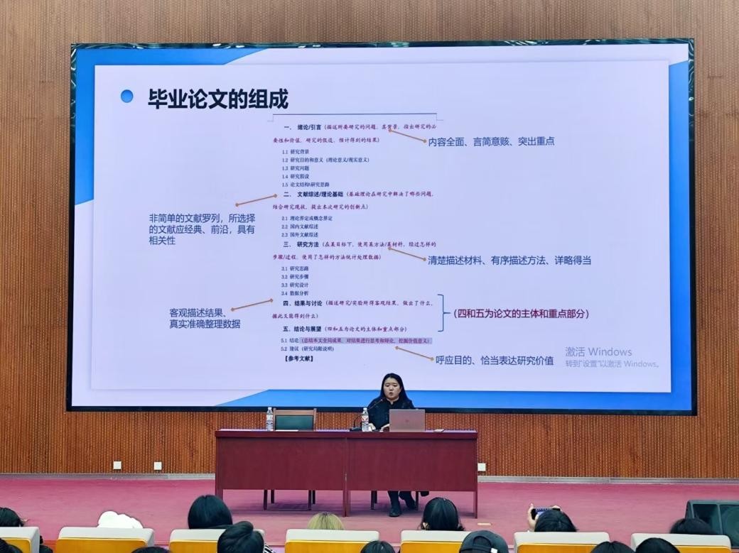 随后,刘雨婷老师详细阐述论文写作前的准备工作。刘老师强调合理选题的重要性,指出选题需结合科学性、可行性以及资料获取的难易度进行综合考量。她建议同学们广泛查阅文献资料,深入了解前人研究成果与不足,为论文写作奠定坚实基础。此外,她还传授了构建论文框架、梳理逻辑脉络的技巧,帮助同学们使论文层次分明、条理清晰。