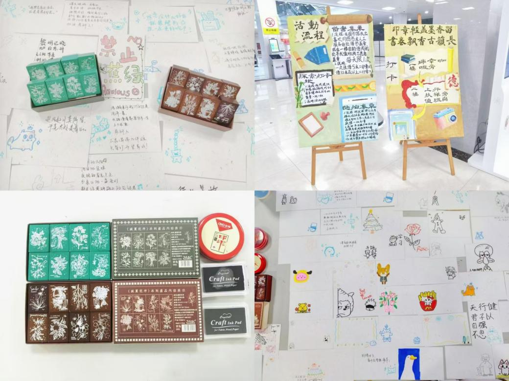 活动前期,志愿者们进行了精心的筹备。他们准备了充足数量的印泥、特色印章以及集章纸,并将其分配到各个负责盖章的志愿者手中。同时,为了营造更加浓厚的活动氛围,图书馆内还布置了精美的展板,展示了活动规则及打卡路线,方便同学们更好地了解并参与到活动中来。