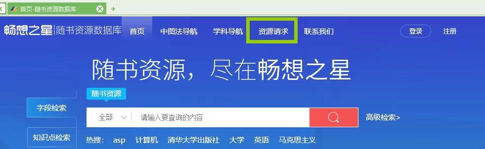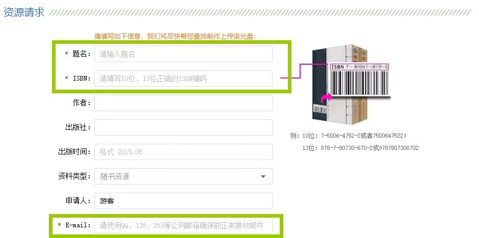 数据库内没有找到所需随书资源,可求助于“资源请求”服务,填写书名、ISBN、和E-mail即可(如下图所示)。
