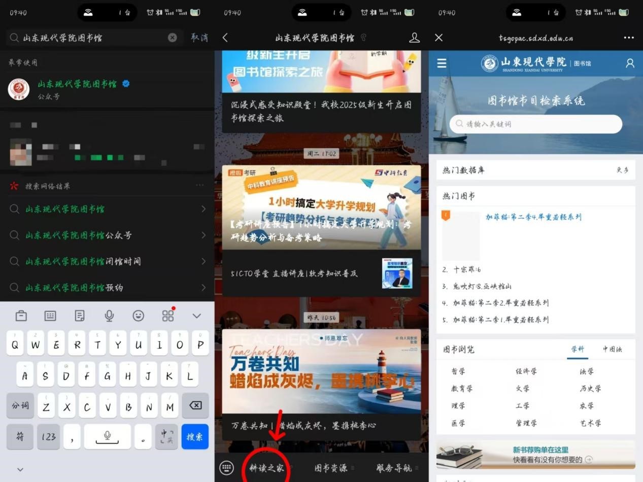 关注“山东现代学院图书馆”微信公众号,点击“耕读之家”,或访问图书馆官网站(图书馆 (sdxd.edu.cn)),点击首页“馆藏查询”入口,即可进入图书馆图书查询系统,输入书名即可查询。