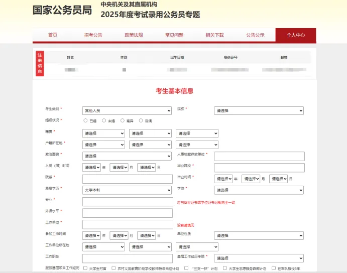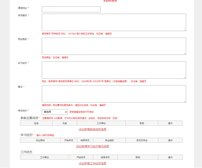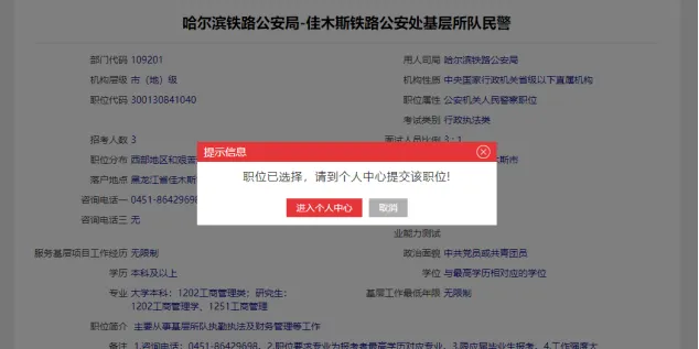考试地点:可以选择全国任意一个考点城市,方便就近考试。报考部门/职位:通过输入“部门代码”和“职位代码”来精准选择。代码务必从官方职位表中查找并核对清楚,一旦提交初审通过将无法修改。是否服从调剂:如果该部门有其他职位空缺,是否愿意被调剂。通常选“否”即可,除非你非常想进入该部门。个人资格审查通过后,无法修改职位!!一定要看清楚再报考!