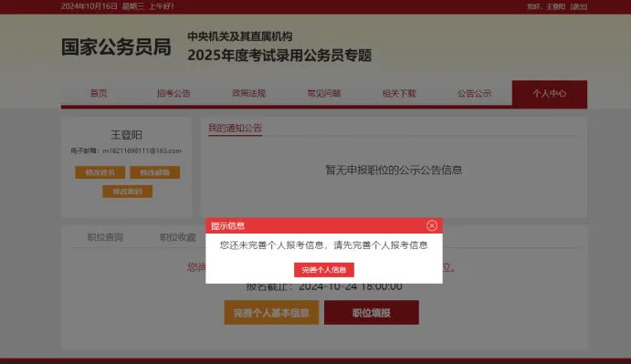 在个人中心完善基本信息,*号空必填。