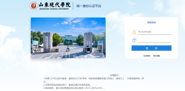 三、跳转至山东现代学院登录界面后,请输入统一认证账号、密码,点击“登录”。