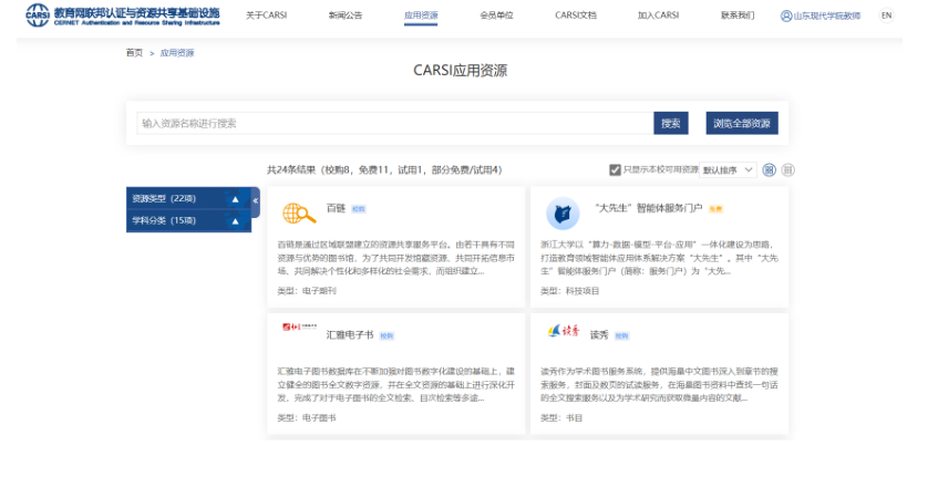 四、接下来就可以访问我校已经购买并已在CARSI上线的学术资源。