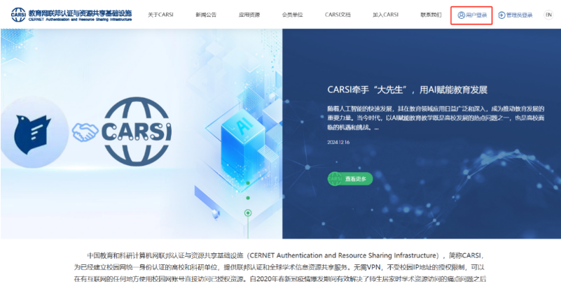 为方便我校师生在校外访问图书馆数字资源,保障学校教学科研活动的顺利开展,我校网络与信息化管理中心和图书馆密切配合,正式加入中国教育和科研计算机网CERNET全球学术资源共享平台CARSI—(CERNET Authentication and Resource Sharing Infrastructure)会员资格,并完成相关资源配置,现对全校师生开通CARSI服务,欢迎大家使用。