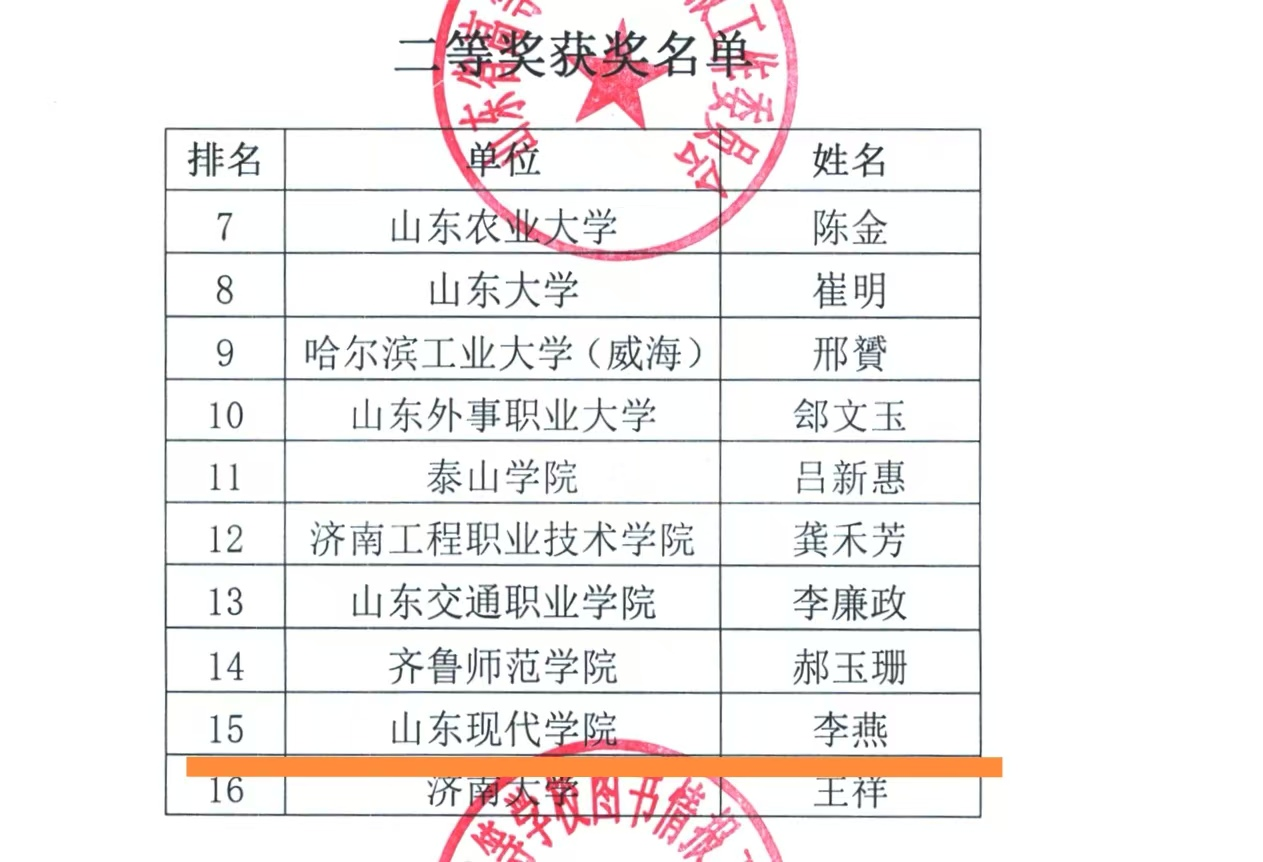 11月11日,第五届山东省高校图书馆馆员业务能力提升“知网杯”网络知识竞赛活动获奖名单揭晓,我校图书馆李燕荣获本次竞赛二等奖。