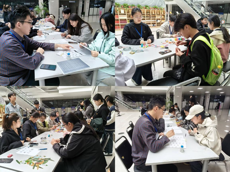 活动当日,图书馆一层大厅化身为一片春意盎然的创意天地,处处洋溢着青春的活力与探索的热情。志愿者们如同春日里最温暖的使者,穿梭于各个活动区域,他们面带微笑,耐心细致地为每一位到场的师生讲解规则,引导大家有序体验。