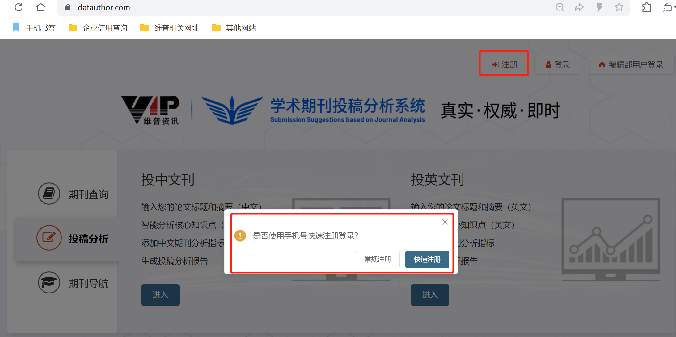 学术期刊投稿分析系统: 首次登录请在IP范围内登录,为保障用户的文献稿件隐私安全,需注册手机号;平台提供“快速注册”、“常规注册”两种注册方式。