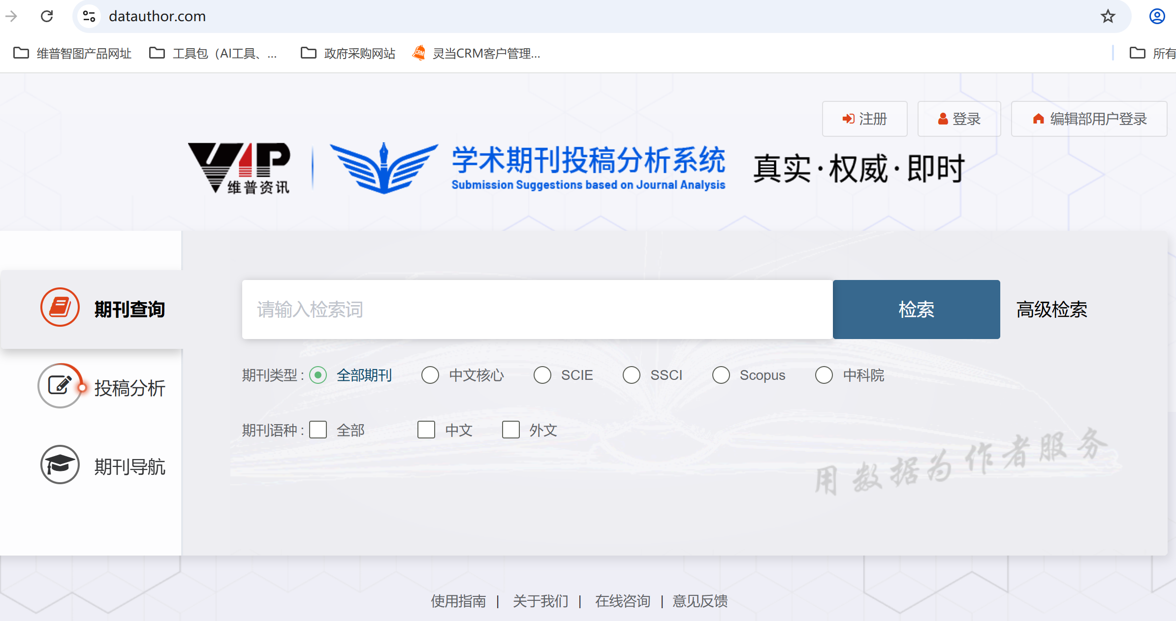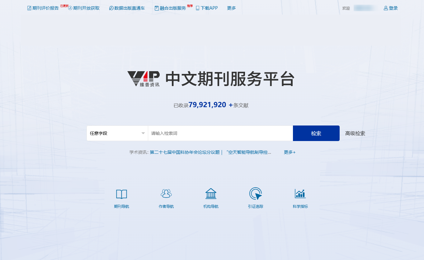 中文期刊服务平台(以下简称“维普期刊”)是由原中国科学技术情报研究所重庆分所,现重庆维普公司打造,起源于1989年,依托《中文科技期刊数据库》提供数据支撑,现已成为中文学术期刊重要的传播与服务平台,可为读者提供文献检索、全文获取、文献统计分析等功能。