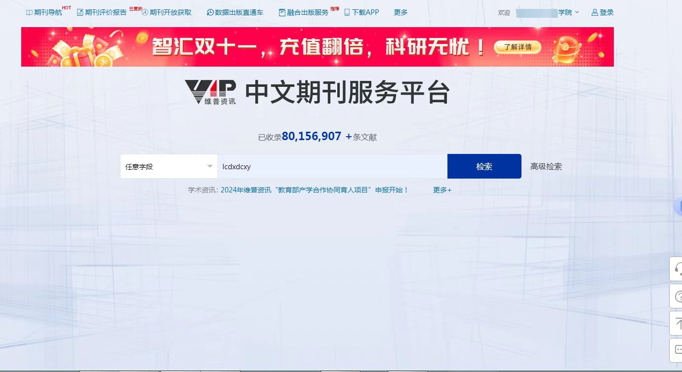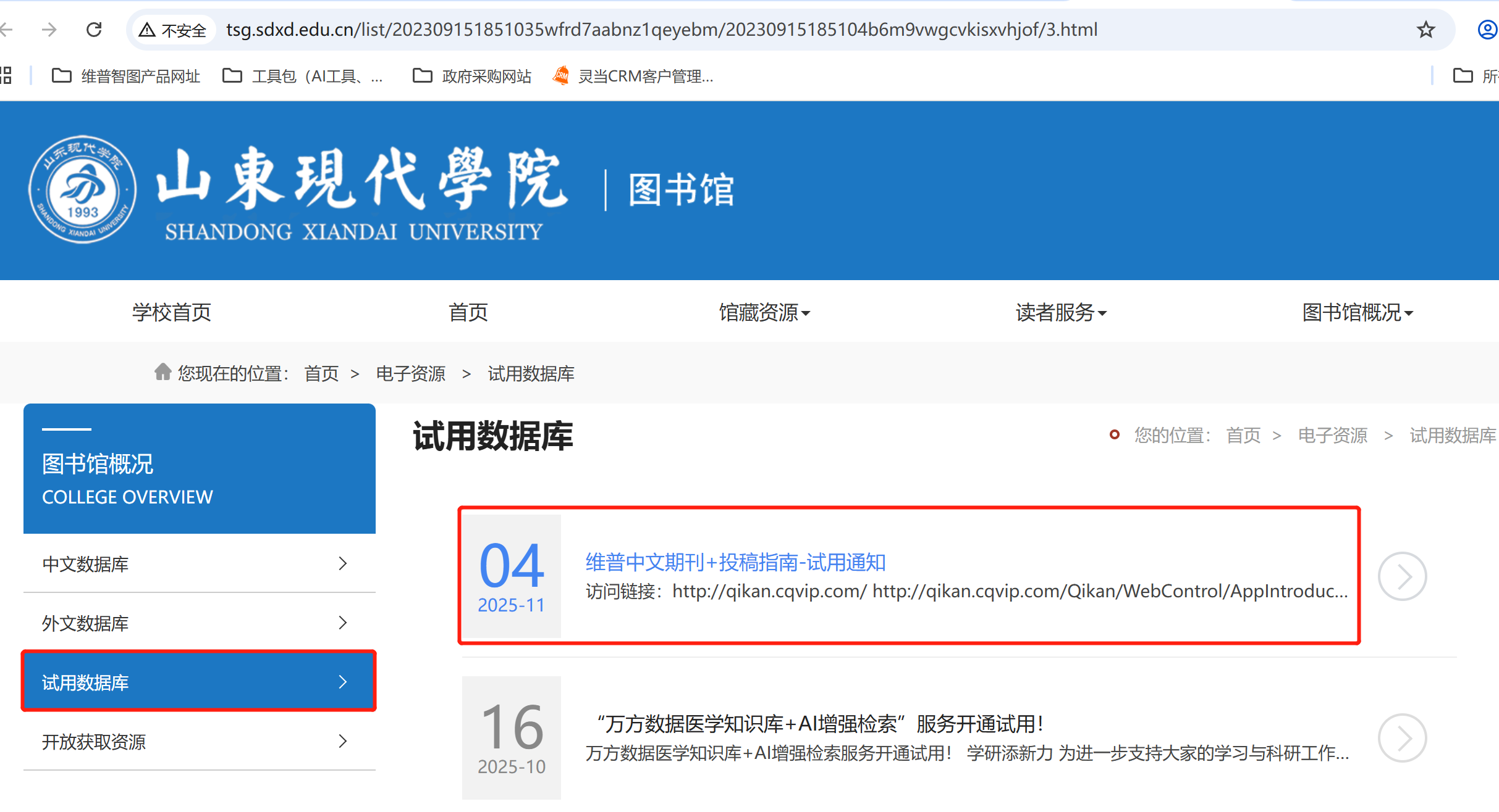 中文期刊服务平台:电脑端可通过校园网IP地范围内的网络自动进行认证,进入网站右上角显示“山东现代学院”标识。用户即可获得维普期刊使用权限。