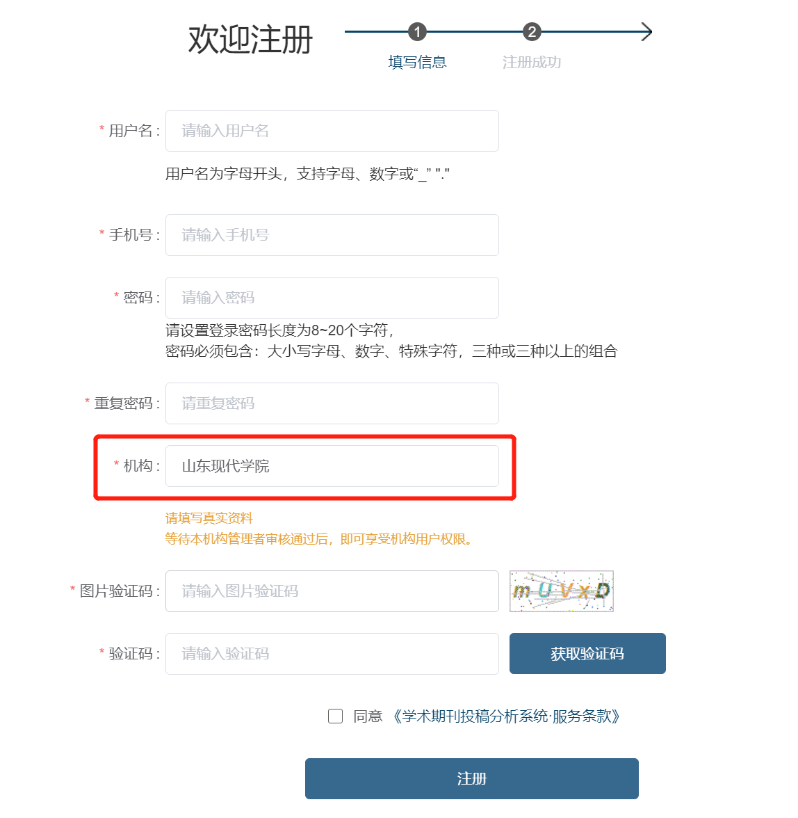 选择“常规注册”时,在机构处搜索并选择“山东现代学院”,并填写相关信息,注册成功后退出后二次登录即可绑定本校权限。认证后的本校作者将获得机构使用权限。